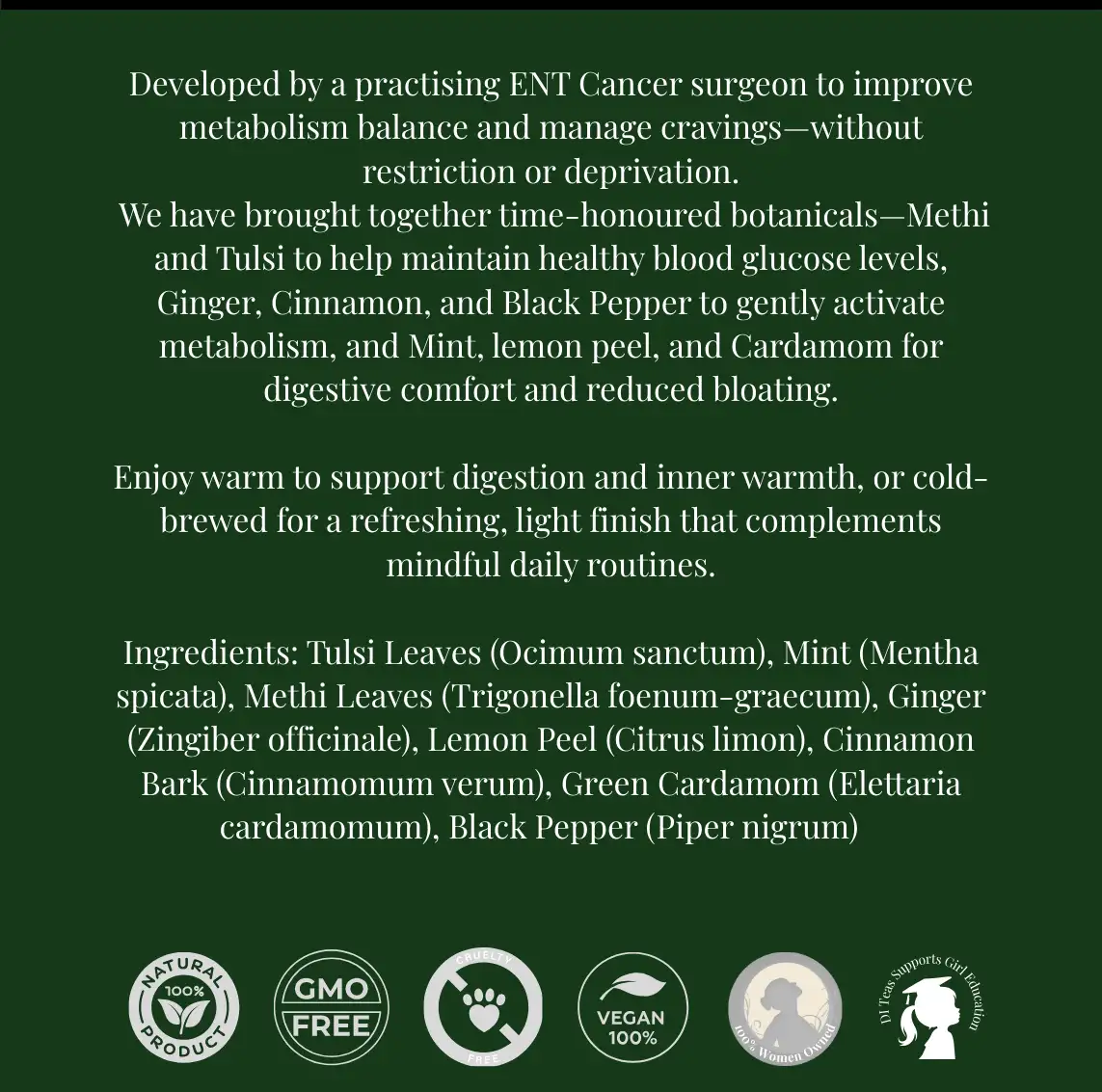 Methi (fenurgeek) supports steady blood sugar, cinnamon and ginger gently awaken metabolism, while mint soothes digestion and reduces the kind of bloating that masks true hunger.