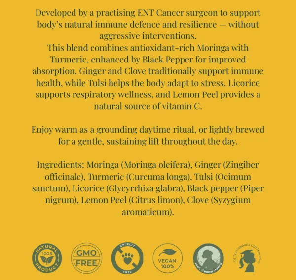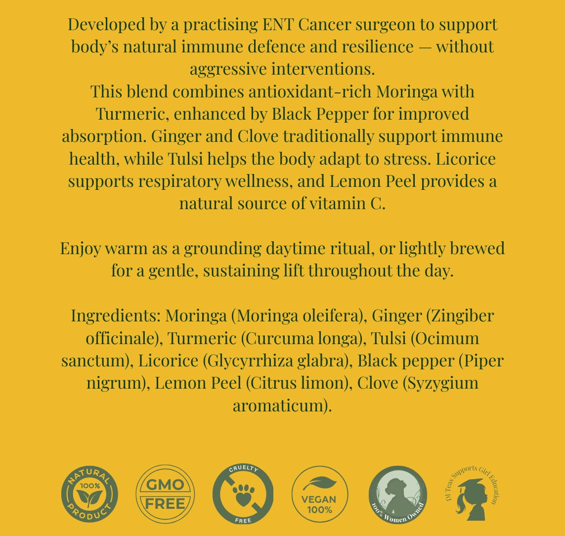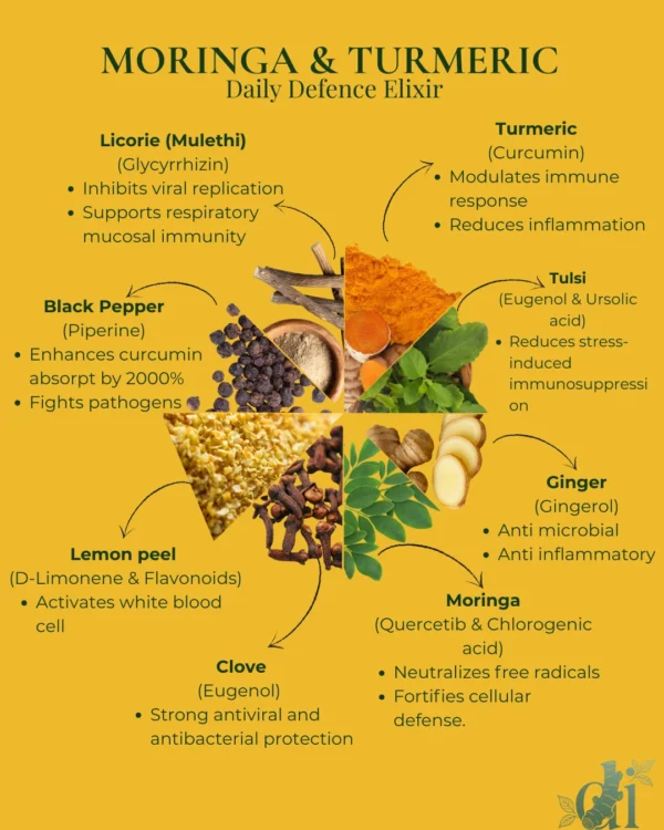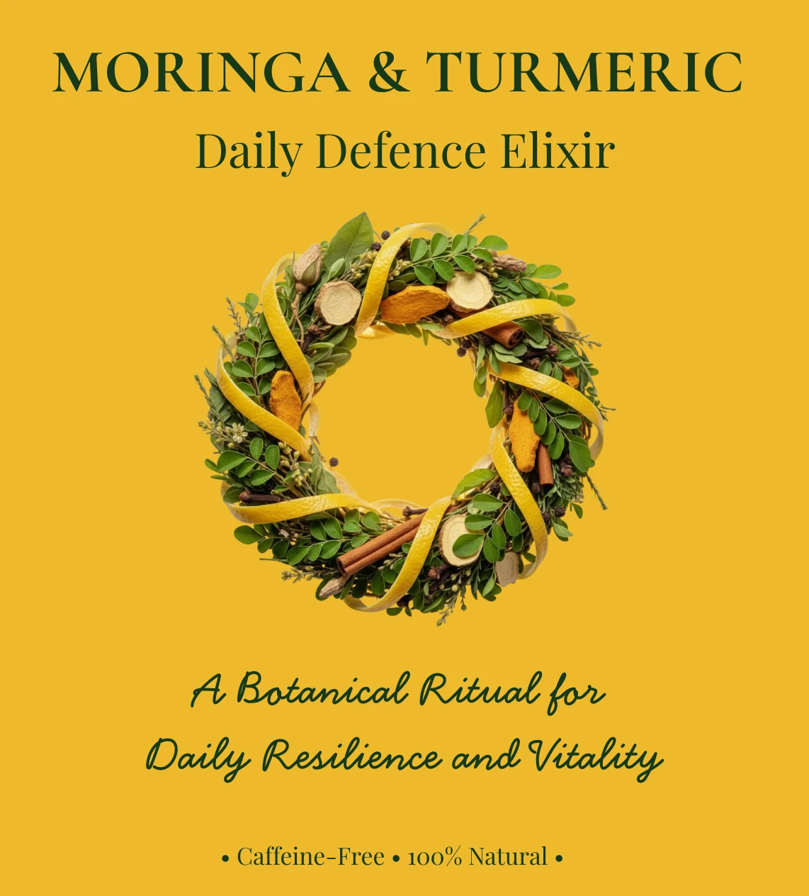 Moringa & Turmeric Daily Defence Elixir is a science-informed herbal ritual created for those seeking everyday vitality without caffeine, crashes, or extremes.